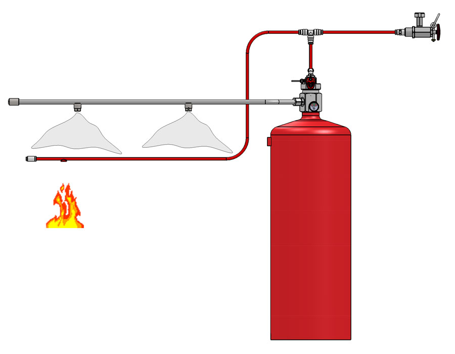 在工作状态中,我们使用惰性气体为火探管灌充不低于1.5MPA的压力,当火探管暴露在火焰或高环境温度下时,管体会在环境中最热的点形成爆破孔,压力下降并激活气缸阀。然后,灭火剂通过阀门上的释放管从喷嘴中排出。因此我们管这种通过火探管或感温元器件进行探测但是通过释放管进行释放的方式称为间接式,我们为选用不同压力属性的灭火介质专门设计了不同的阀门系统(高压间接式IHP)和(低压间接式ILP)。
